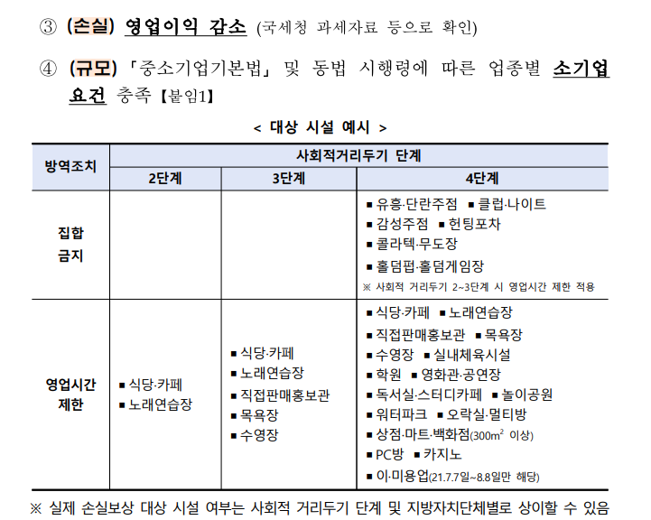 소상공인 손실보상 지원 대상은 2021년 7월 7일부터 9월 30일 동안 집합금지, 영업시간제한 조치를 이행하면서 영업이익이 감소하여 경영상 심각한 손실이 발생한 중소기업기본법 상의 소기업을 지원 대상으로 합니다.